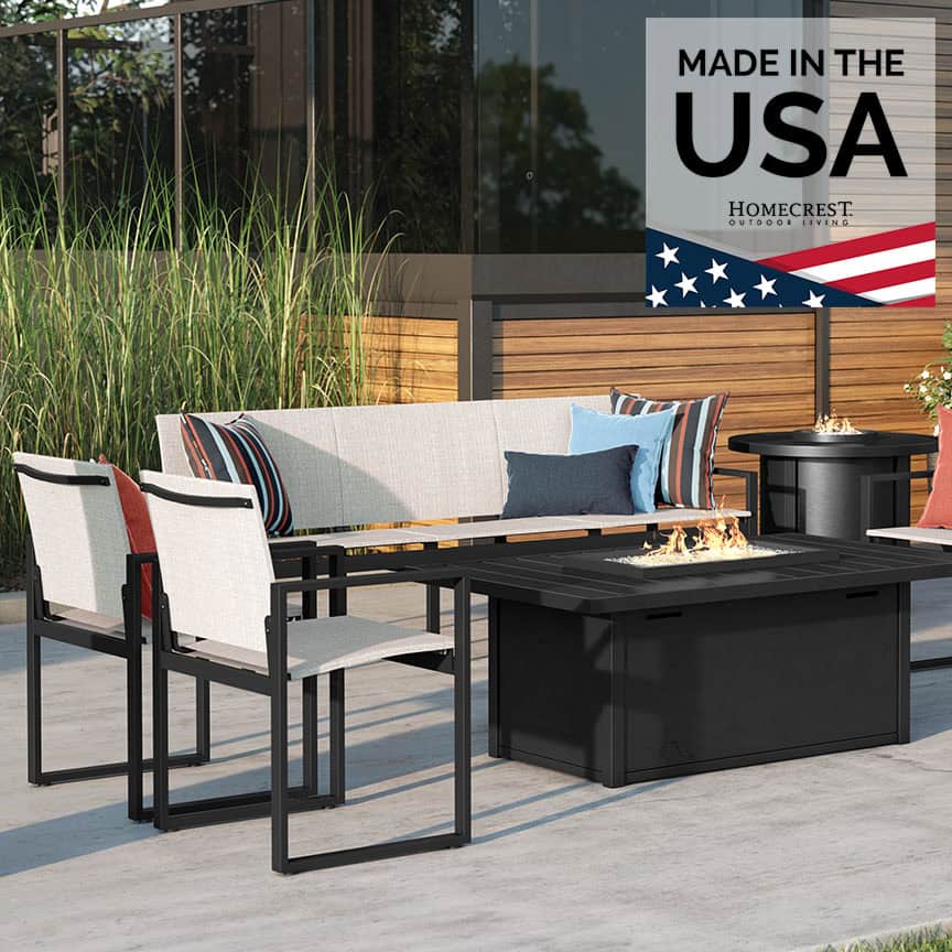 Sensation sling fabrics, offered exclusively by Homecrest, are unique in the outdoor furniture industry. They combine the strength and UV-stability of PVC fibers with the comfort and outstanding memory of elastomeric yarns. Combine this with Homecrest’s proprietary double layer, ergonomically contoured sling technology, and you get arguably the most comfortable outdoor sling chair on the market. The fabric stretches and moves according to the frame of the person sitting in it, while providing excellent support and comfort. Homecrest is proud to manufacture its iconic designs in America and support quality workmanship with the industry’s most comprehensive product warranty.