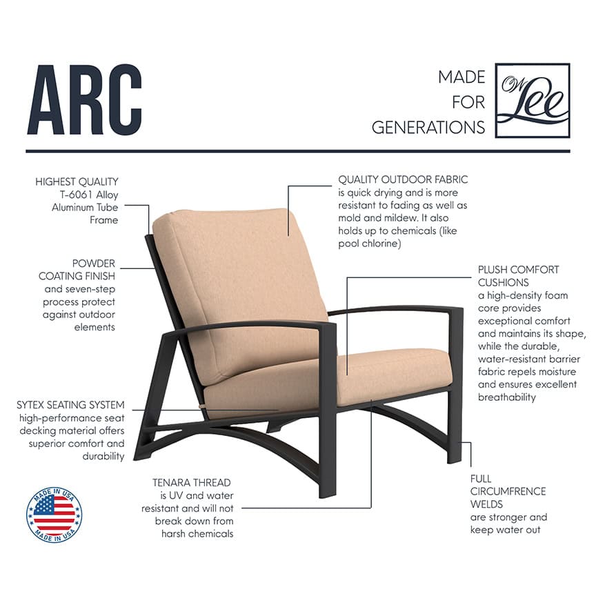 Crafted with meticulous attention to detail, the aluminum Arc Ottoman by O.W. Lee embodies the essence of modern craftsmanship and style. Arc features clean, swooping lines that evoke the sensation of gliding through tranquil waters, inviting you to unwind in comfort and sophistication. Arc’s plush cushions and durable materials are designed to withstand the elements and transform your space into a sanctuary of relaxation.