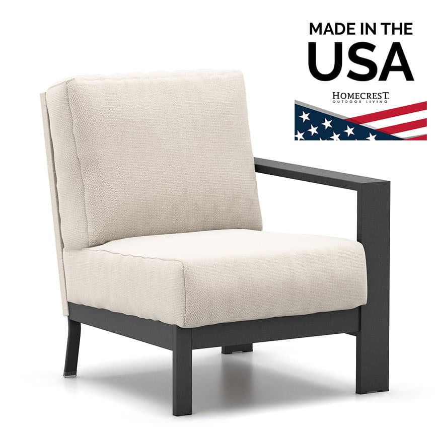 Best of all, each frame, cover, and cushion is crafted by Homecrest’s skilled team in the USA. Homecrest is proud to manufacture its iconic designs in America and support quality workmanship with the industry’s most comprehensive product warranty. Sectional units are not standalone pieces. We recommend using end units with arms on all modular configurations due to exposed brackets on armless versions.