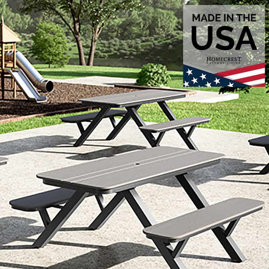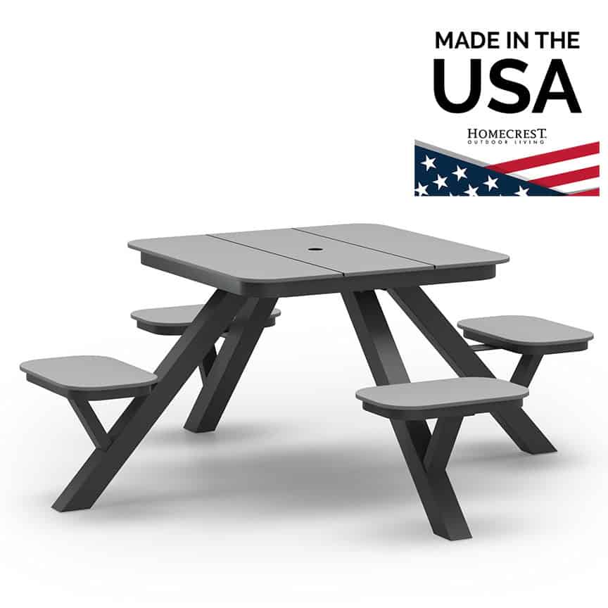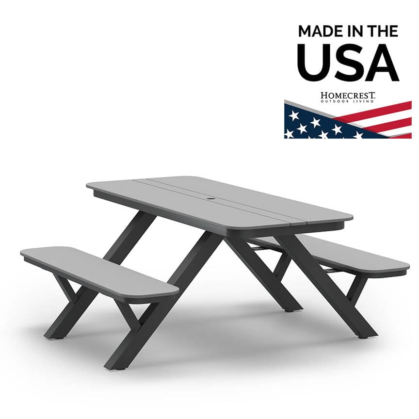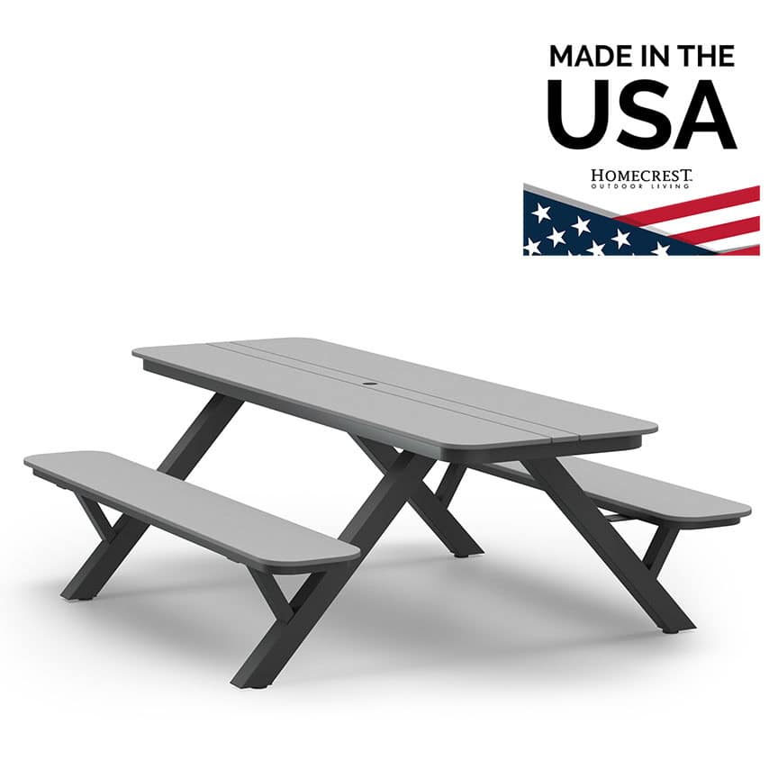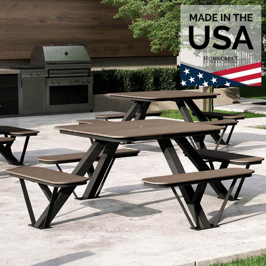 Elevate your outdoor dining experience with Homecrest’s Bridger Tables. Constructed with a powder-coated aluminum frame and durable all-weather poly (HDPE) top and seats, Bridger visually resembles natural wood but eliminates the upkeep and maintenance that comes with it. Transform your outdoor space with this sturdy picnic table that combines robust design and practical elegance.