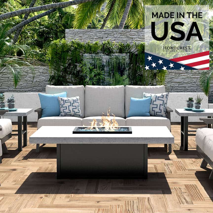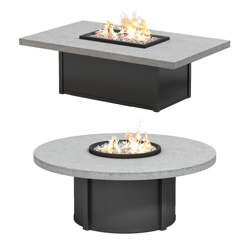 The Concrete Fire Table by Homecrest has the perfect top for achieving a modern, industrial look. Homecrest’s concrete tops are a part of their Natural Series collection, which brings a sophisticated organic design element to outdoor spaces utilizing the latest in composite technology. Homecrest fire tables offer a powerful burner (up to 65,000 BTUs) and come standard with your choice of fire jewelry, as well as a secure key and black 3/4 in. aluminum fire burner riser.