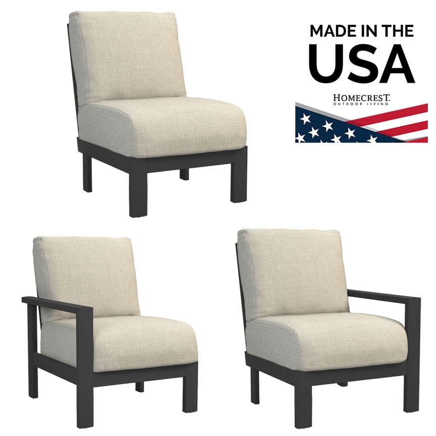 Homecrest is proud to manufacture its iconic designs in America and support quality workmanship with the industry’s most comprehensive product warranty. Sectional units are not standalone pieces. We recommend using end units with arms on all modular configurations due to exposed brackets on armless versions.
