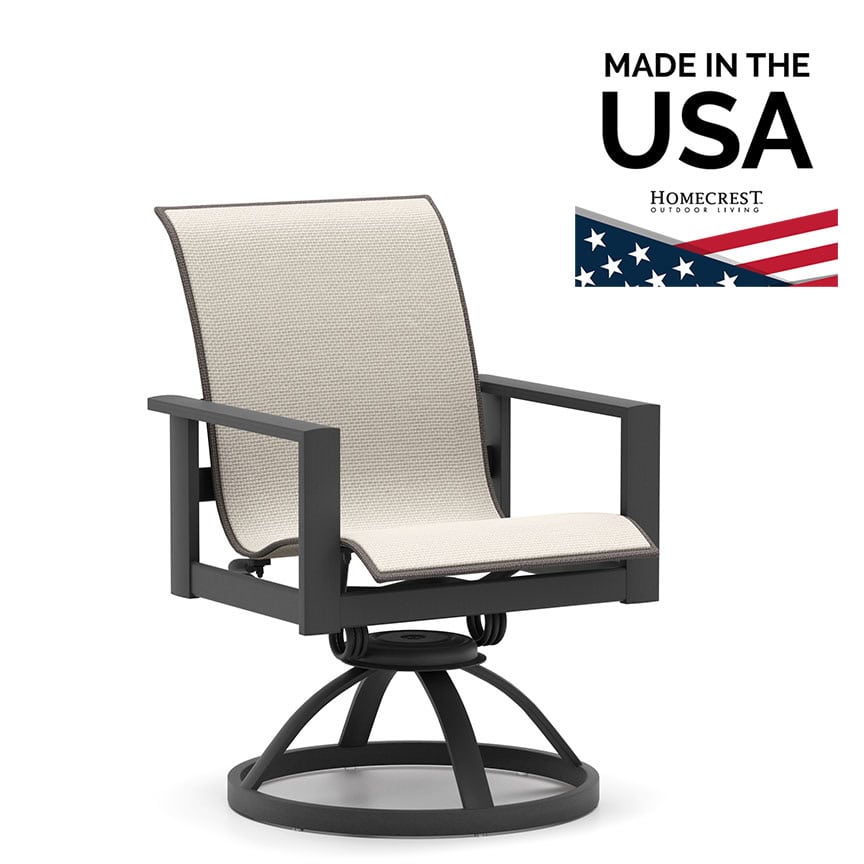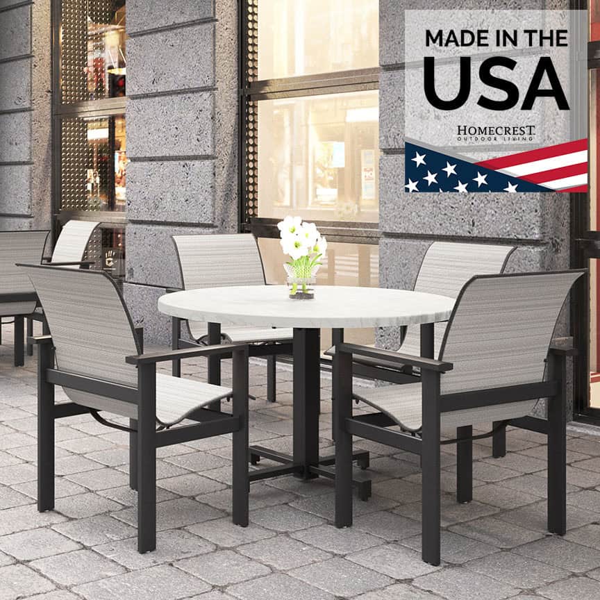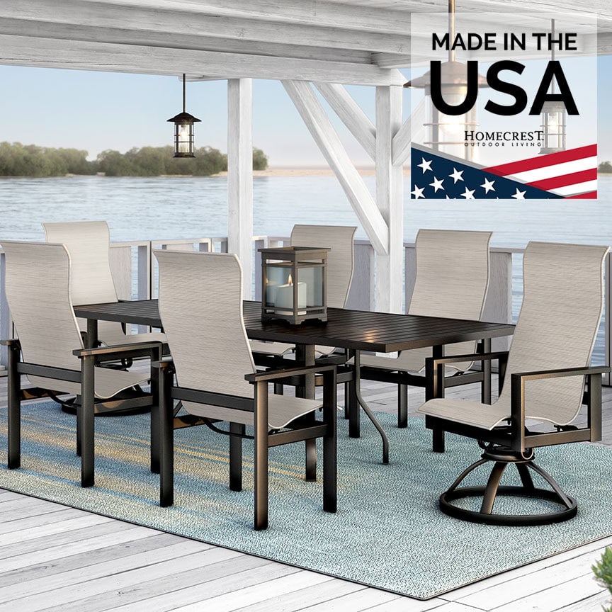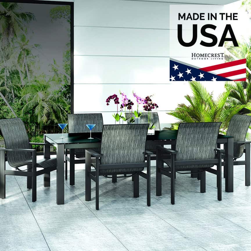 Sensation sling fabrics, offered exclusively by Homecrest, are unique in the outdoor furniture industry. They combine the strength and UV-stability of PVC fibers with the comfort and outstanding memory of elastomeric yarns. Combine this with Homecrest’s proprietary double layer, ergonomically contoured sling technology, and you get arguably the most comfortable outdoor sling chair on the market. The fabric stretches and moves according to the frame of the person sitting in it, while providing excellent support and comfort. Homecrest is proud to manufacture its iconic designs in America and support quality workmanship with the industry’s most comprehensive product warranty.