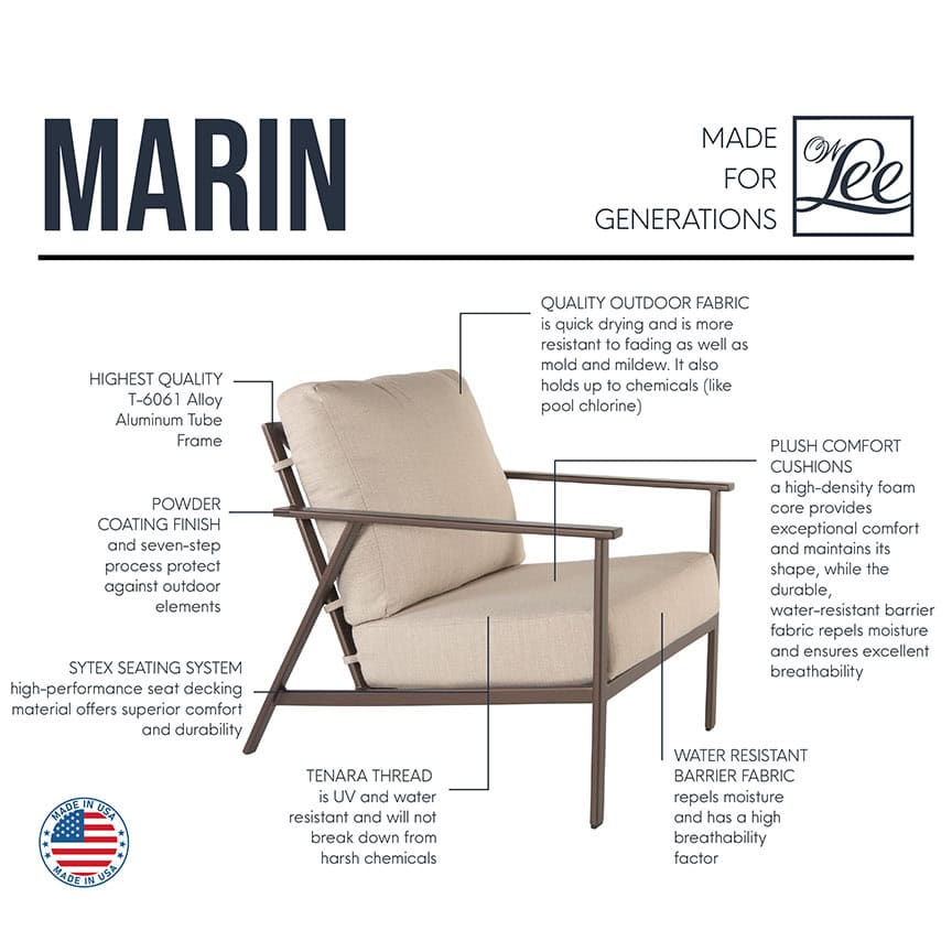 The Marin Ottoman by O.W. Lee is inspired from the Northern California coastal community of Marin County, located just north of San Francisco’s Golden Gate Bridge. Taking cues from both natural elements as well as modern design, Marin exemplifies the relaxed yet sophisticated nature of the area. Marin is a full-line wrought aluminum collection that includes sling, padded sling, and cushioned dining, deep seating, and a sling chaise lounge. Marin’s cushioned deep seating features O.W. Lee’s Plush Comfort cushions and Sytex seating systems, which create a superior level of comfort.