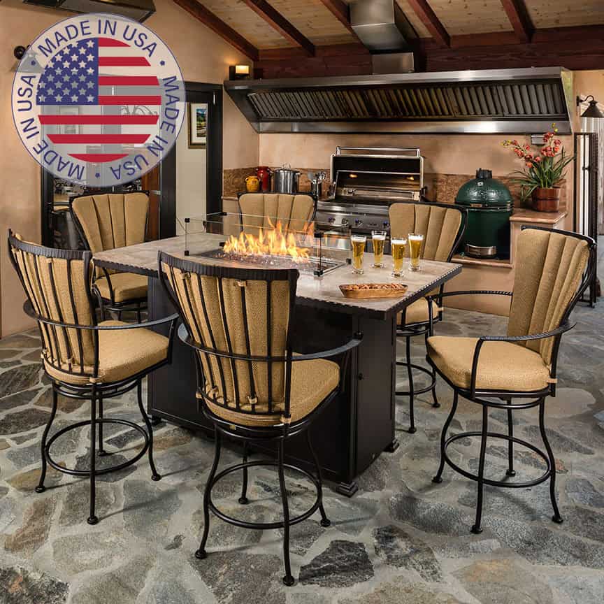 The Monterra Dining Swivel Rocker Chair is inspired by Southwestern and Mediterranean influences, combining rustic charm with a touch of elegant warmth and timeless appeal in Wrought Iron. The style reflects a blend of Old World craftsmanship, earthy tones, and textural richness, evoking the spirit of both desert landscapes and Mediterranean villas. Made from 0.75” tubular steel that gently curves to the shape of your back and 1.5” embossed flat bar that joins the arms into the back to create a smooth rounded nest for summer time relaxation. Each piece is also detailed with hand hammered rivets for an aged look and feel. This collection includes dining chairs, counter stools, bar stools, ottomans, a chaise and sectional pieces. Lounge chairs, loveseats, and sofas are offered in both urban and traditional scales.