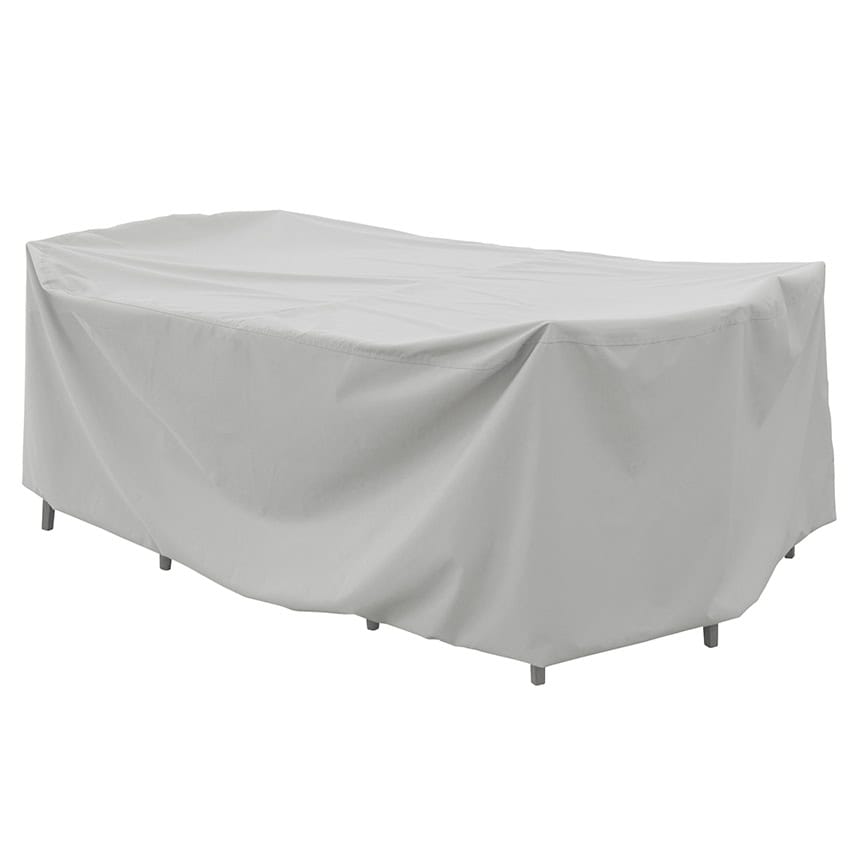 The PFC592 Small Rectangle Oval Table & Chairs Cover is made with a Treasure Garden coated polyester 300D gray exclusive fabric. Designed to be durable, breathable, and water resistant and will not crack or peel like vinyl. The protective cover is equipped with elastic, 8 ties, and spring cinch locks to ensure a secure fit, along with a storage bag when cover is not in use. These features prevent the cover from being blown away by wind, providing reliable protection for your furniture even in adverse weather conditions.