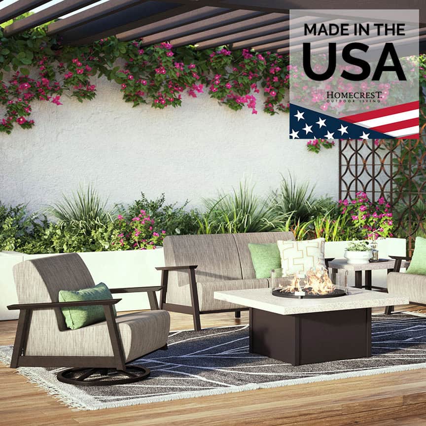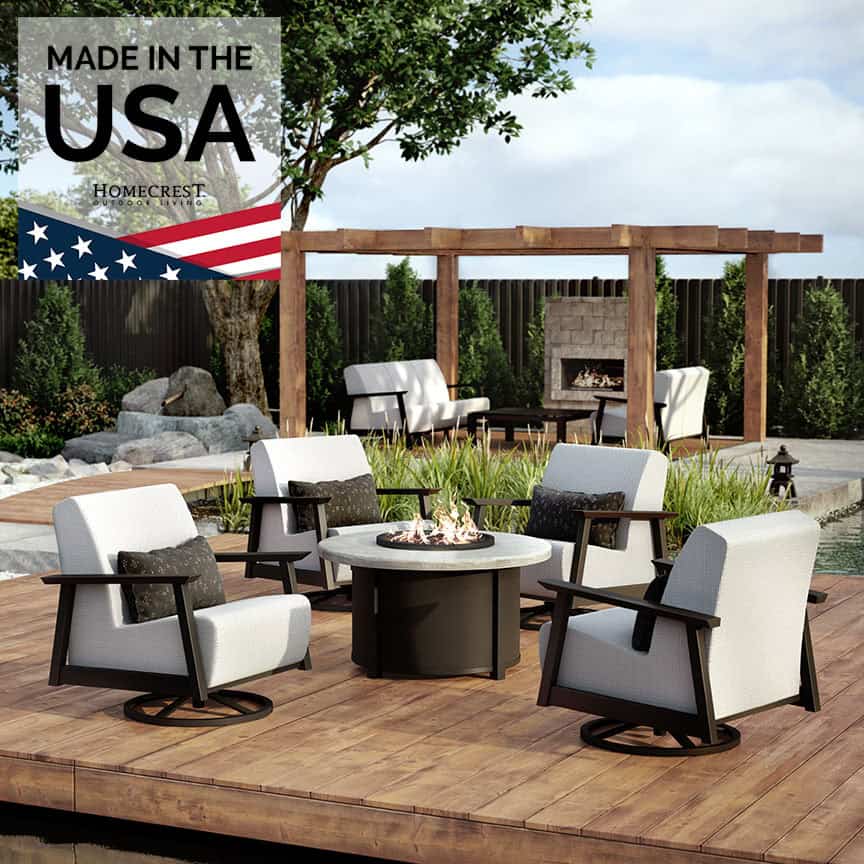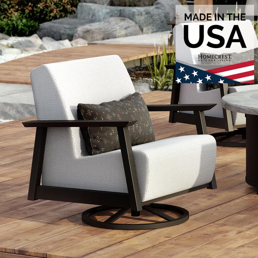 Sensation sling fabrics, offered exclusively by Homecrest, are unique in the outdoor furniture industry. They combine the strength and UV-stability of PVC fibers with the comfort and outstanding memory of elastomeric yarns. Combine this with Homecrest’s proprietary double layer, ergonomically contoured sling technology, and you get arguably the most comfortable outdoor sling chair on the market. The fabric stretches and moves according to the frame of the person sitting in it, while providing excellent support and comfort. Homecrest is proud to manufacture its iconic designs in America and support quality workmanship with the industry’s most comprehensive product warranty.