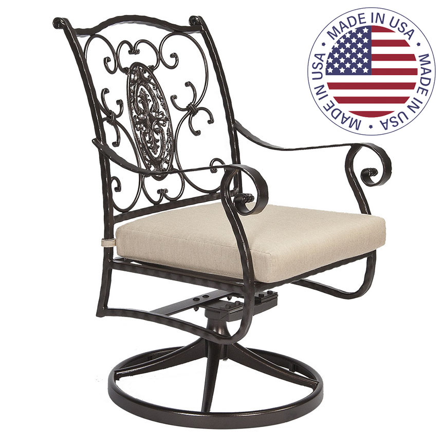 Inspired by the historic Spanish cathedral at the heart of Cuba’s Old Havana, the San Cristobal Dining Swivel Rocker Chair captures the romance and artistry of the Spanish Baroque style. With its flowing curves and intricate detailing, this collection showcases true craftsmanship through elements like hammered bar tubing and hand-forged scrollwork. This collection features dining chairs, counter stools, bar stools, lounge chairs, a love seat, sofa, sectional, ottoman, chaise, and matching table bases.