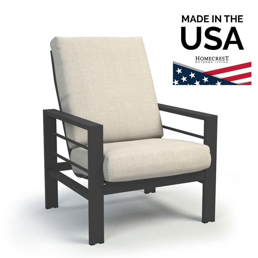 Plush, all-weather cushions, plus strong frame lines created by durable aluminum are just the beginning of what makes Homecrest’s Sutton High Back Chat Chair a prime choice for discerning homeowners and designers. Creating an outdoor space with a sophisticated aesthetic is easy with Sutton cushion’s bold shapes; its gently sloping backs promote and exclusive Luxe Outdoor cushions promote restful lounging, while striking a modern pose with its visual style. This collection is sure to make any outdoor space feel inviting. Custom aluminum extrusions are used for the arms and base to provide a low-maintenance and corrosion-free frame.