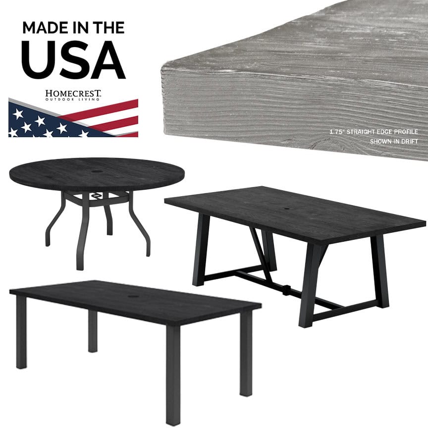 Cast from beautiful reclaimed wood tables, Homecrest’s popular Timber Dining Table is on trend and timeless. Using the same technology Homecrest uses in all Natural Series tops, they are able to achieve a look that is marvelously realistic while retaining the outstanding outdoor performance characteristics you expect from Homecrest. Timber tops are made with extremely durable materials, allowing them to withstand even the toughest weather conditions. Timber is available in a variety of authentic colors to coordinate with unique color themes.