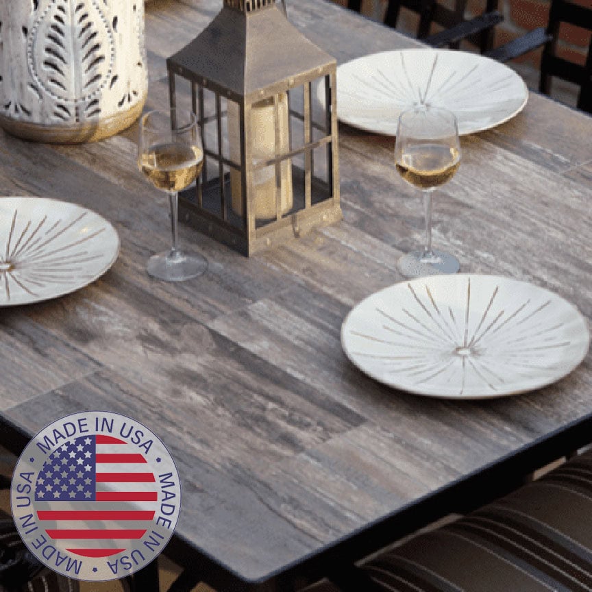 O.W. Lee’s Modern Porcelain Top Dining Table offers an elegant, beautiful, and sturdy outdoor table that can provide decades of dining entertainment. The porcelain tiles are made of O.W. Lee’s commercial grade porcelain tile top that are fired at temperatures higher than ceramic tiles to make the porcelain tiles more dense, less porous, and much harder. This baking method makes the surface of these tiles non-porous, preventing water from being absorbed and potentially freezing and cracking the tiles. This productions method also makes the tiles fade and stain resistant. The aluminum metal rim around the tiles prevents any damage to the edges of the tiles from chairs or other objects.